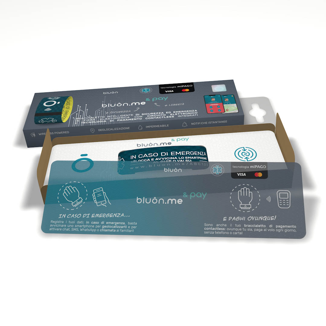 Sicurezza personale e pagamenti contactless nel braccialetto elastomerico dal peso di soli 2 grammi. Per aziende e brand, per banche, fintech e insurtech, bluon.me & pay può diventare una piattaforma di servizi fintech e loyalty, integrabile con circuiti di pagamento VISA o Mastercard, con CRM o programmi membership.
