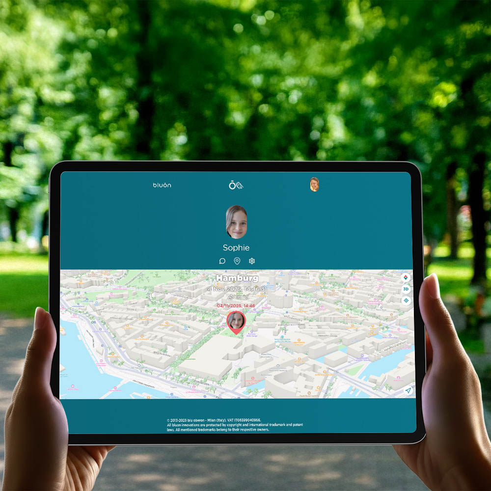 De talla única, adecuada para niños de 1 a 12 años, se comunica con moviles y ordenadores: geolocaliza la posición del hallazgo y permite llamar, enviar mensajes o chatear automáticamente con miembros de la familia.