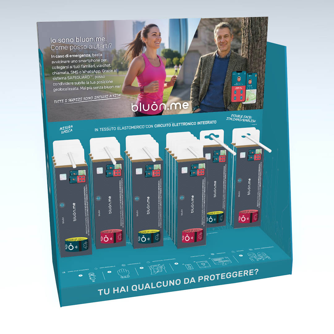 Il kit di braccialetti intelligenti bluon.me comprende 12, 24 o 36 braccialetti assortiti nei due colori Oceanic e Cherry Crush (mentre la taglia è unica), un espositore da banco, un mazzetto di cartoline e la vetrofania di rivenditore autorizzato. Il kit è acquistabile con uno sconto del 35% sull’imponibile (13,27 € / cad.).